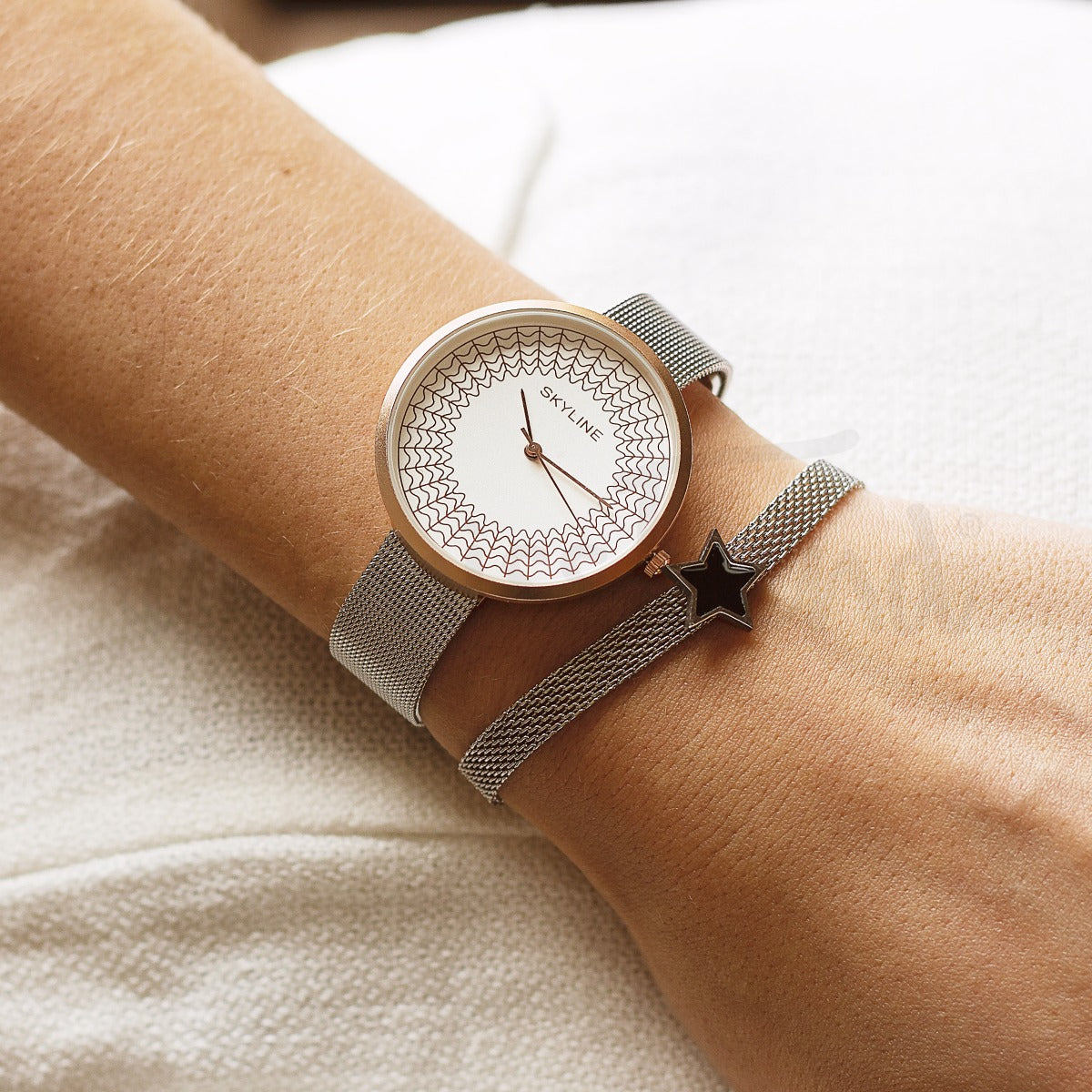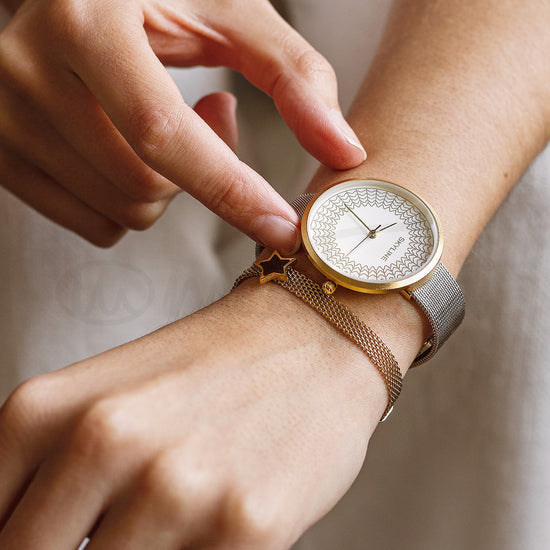 O relógio Espiral é composto por uma bracelete em aço com fecho gancho.