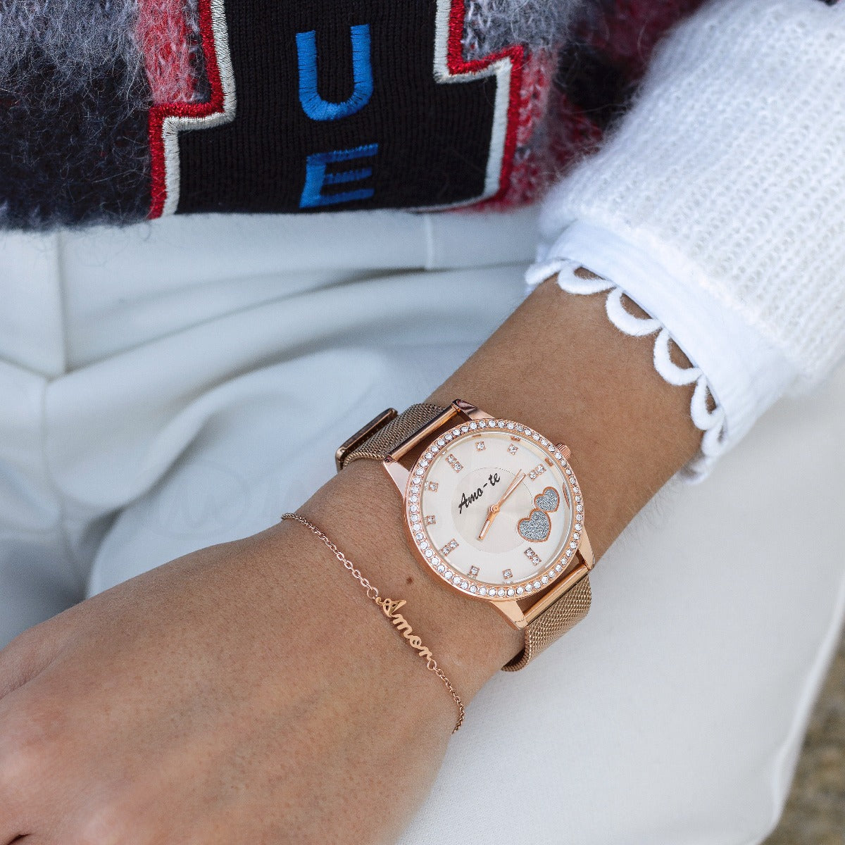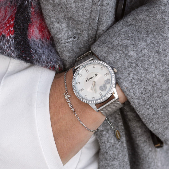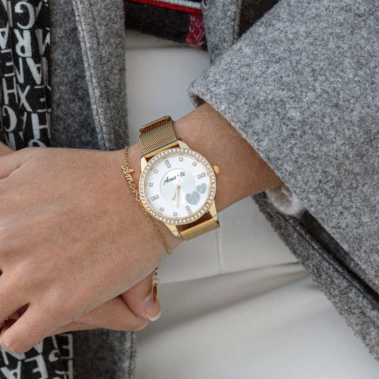 Relógio com dedicatória Amo-te com aro com brilhantes cravados. Interior do mostrador branco com dois corações com brilhantes.