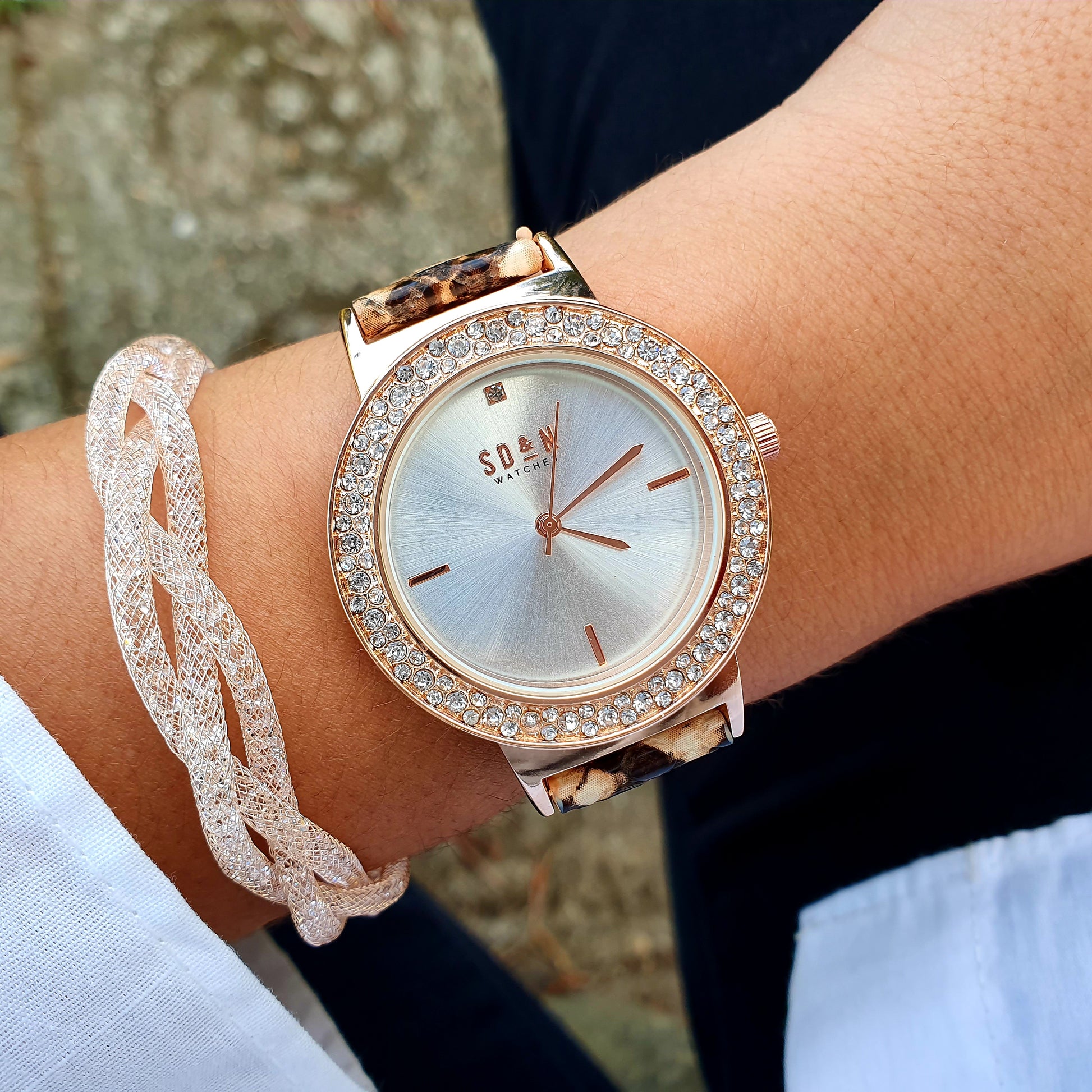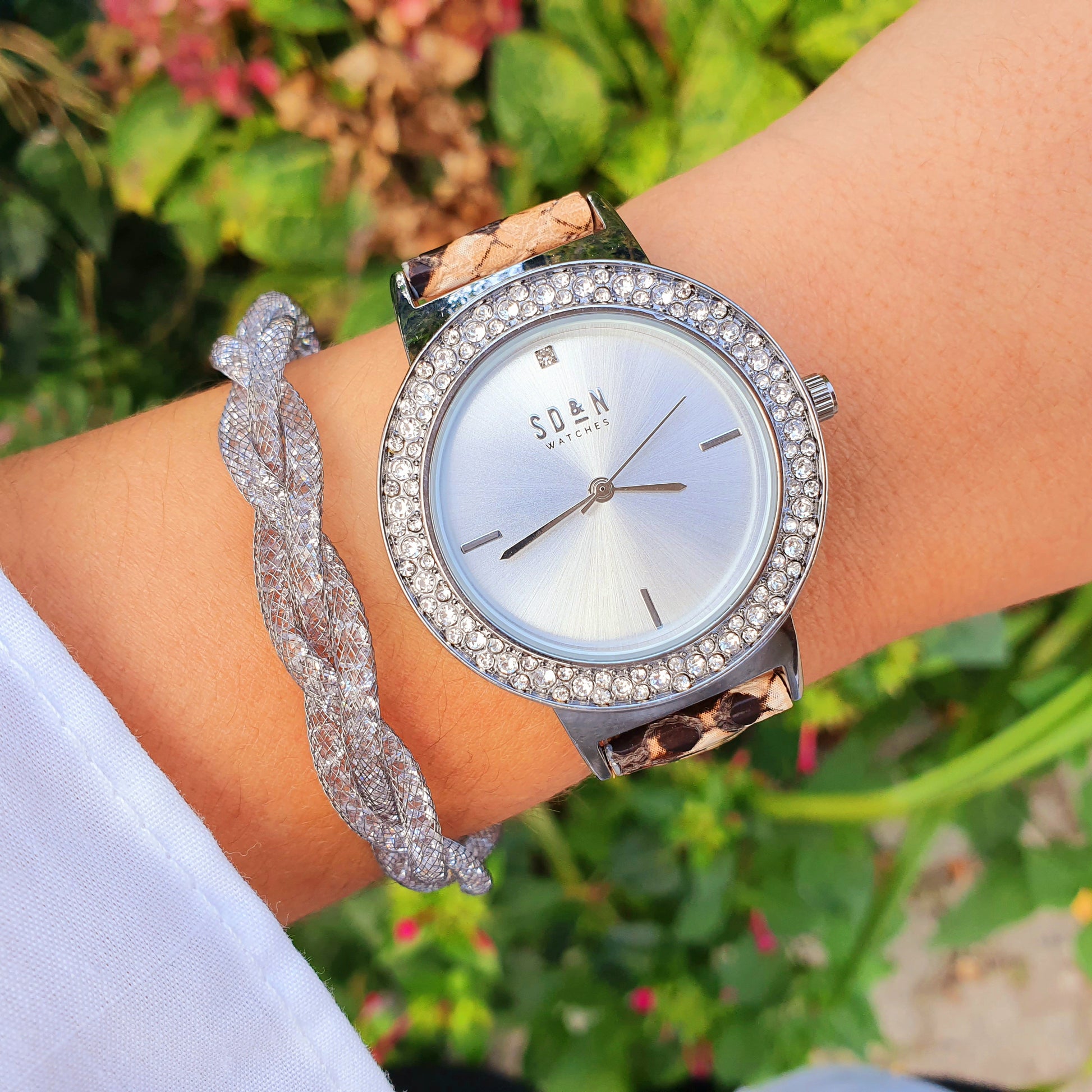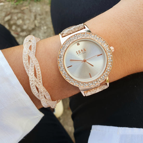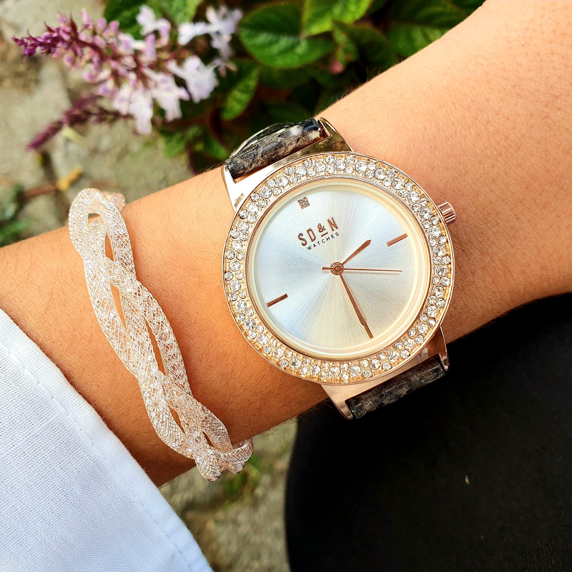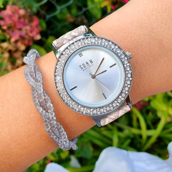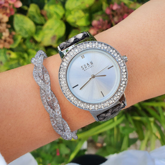 Relógio com aro com cristais cravados com um mostrador moderno e elegante. Projetado com uma bracelete efeito pele de cobra.