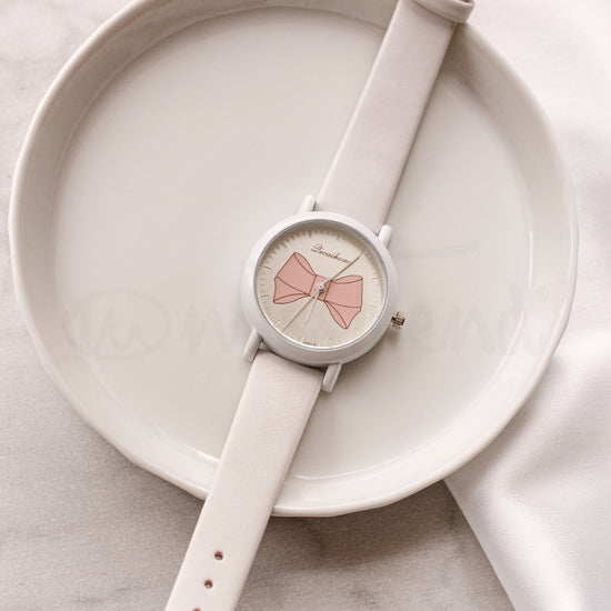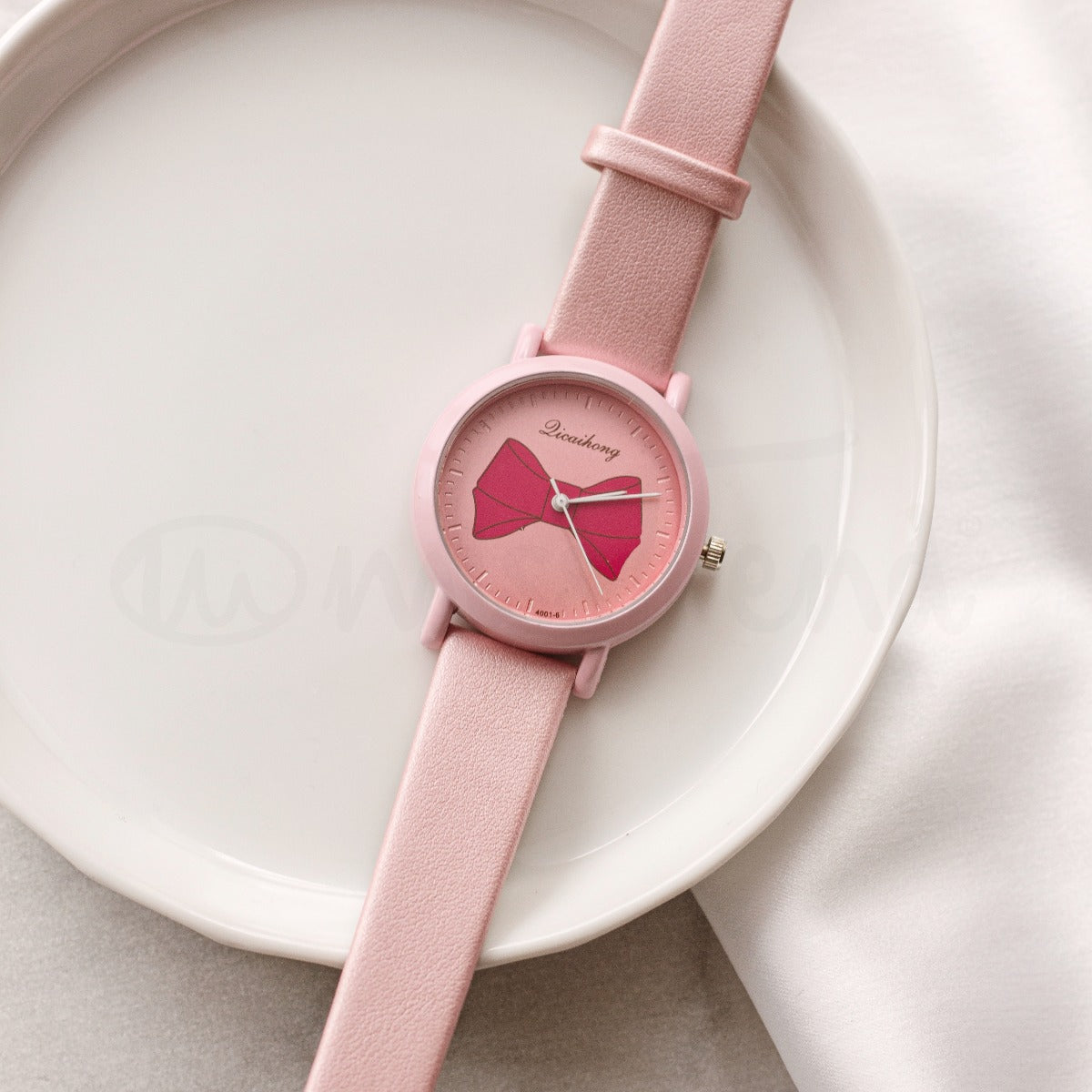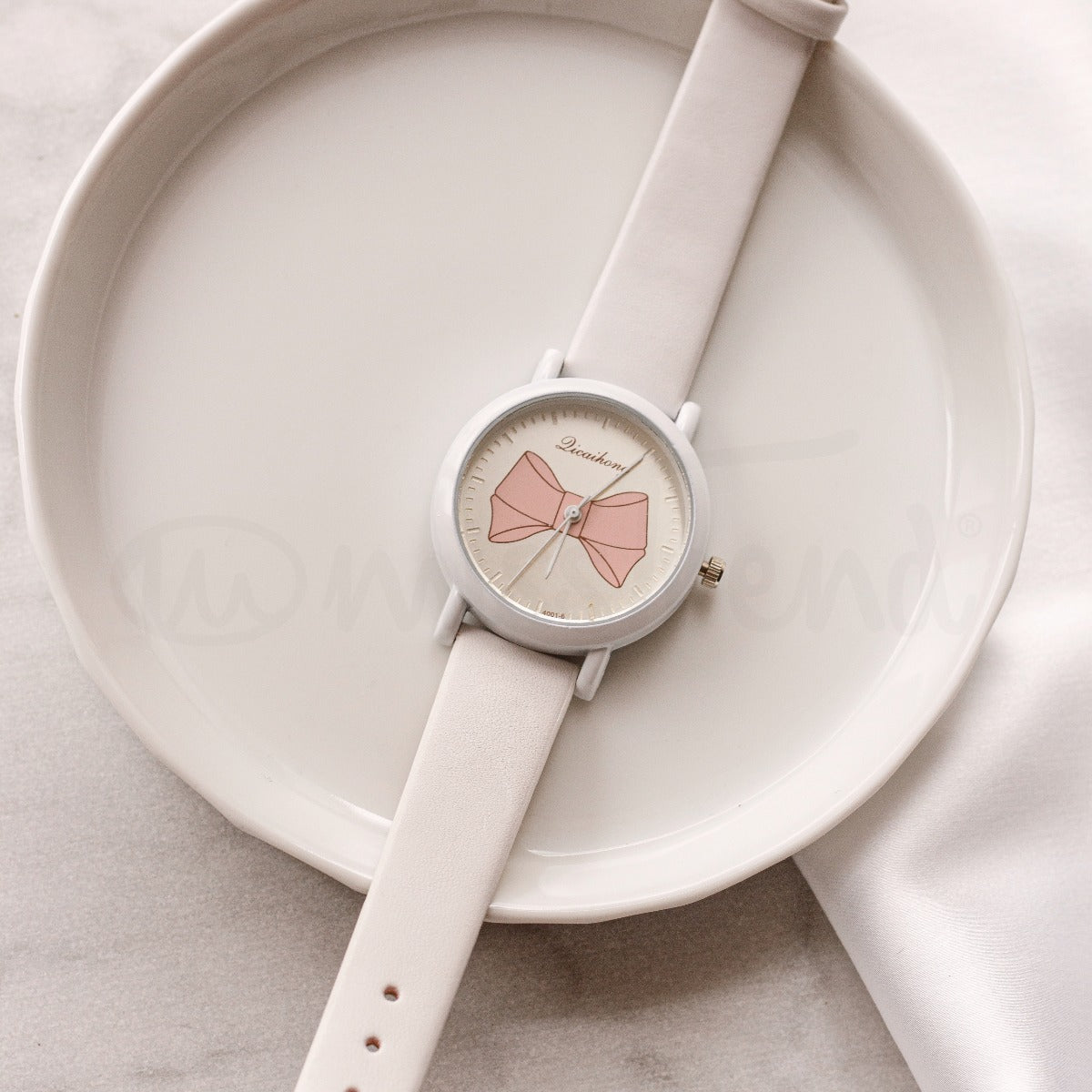 Relógio com desenho de um laço no interior do mostrador. Composto por uma bracelete em pele sintética com fecho fivela de um pino.