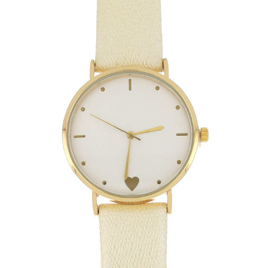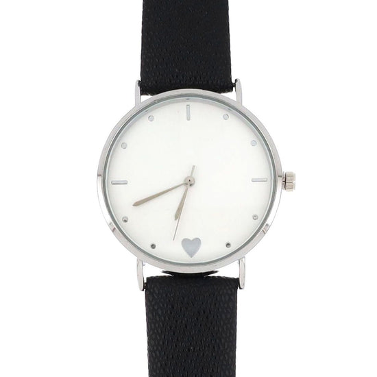 Relógio simples e elegante com pequeno coração composto por uma bracelete em pele sintética.