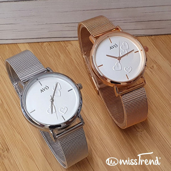 Relógio com dedicatória Avó com corações, com bracelete em aço ajustável.