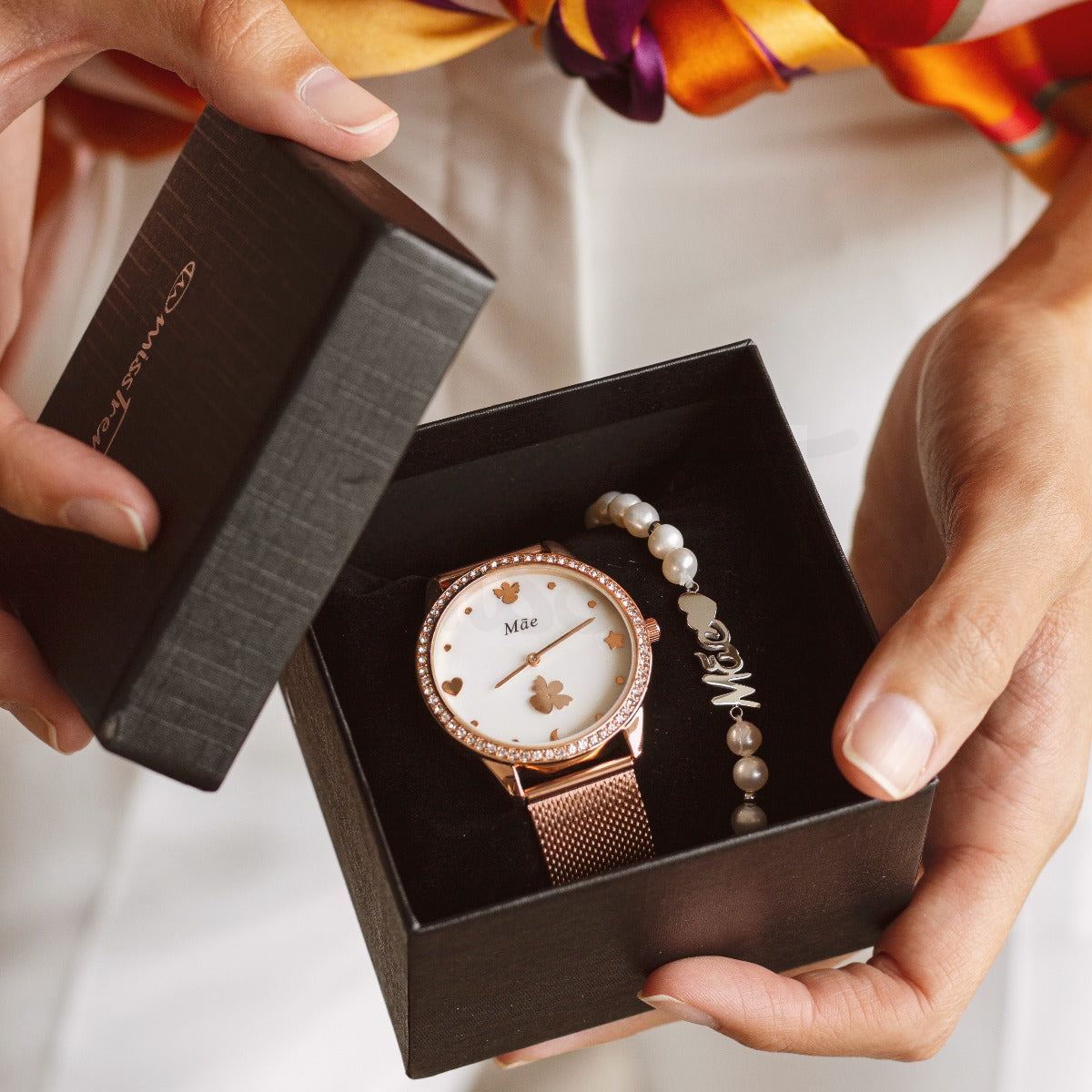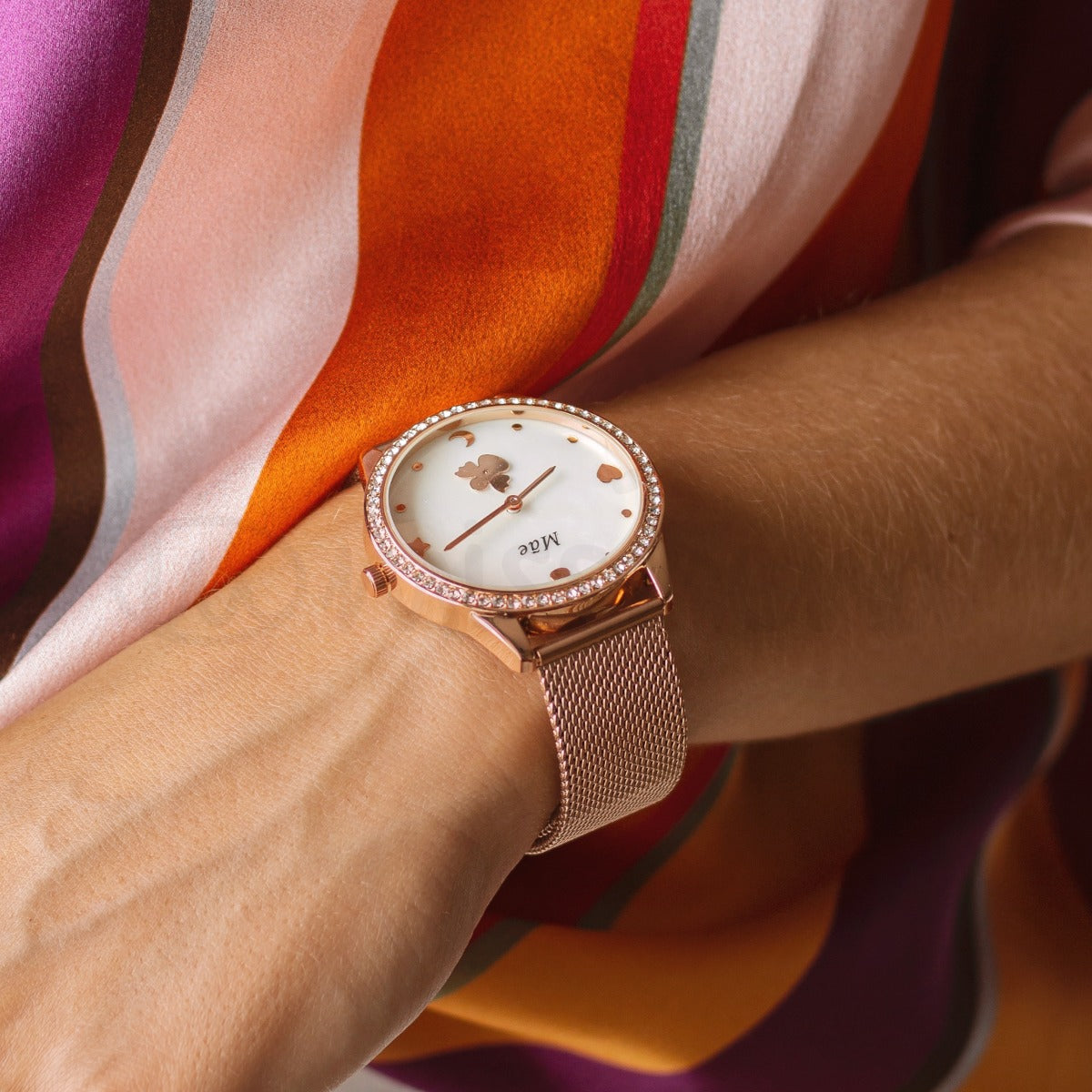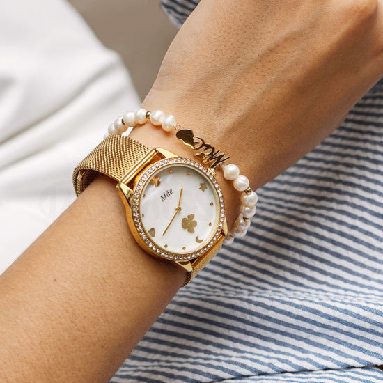 Relógio com fundo madre pérola com dedicatória Mãe. Com um design moderno e elegante com um aro repleto de brilhantes e imagens de anjos, flor, lua, coração e estrela.