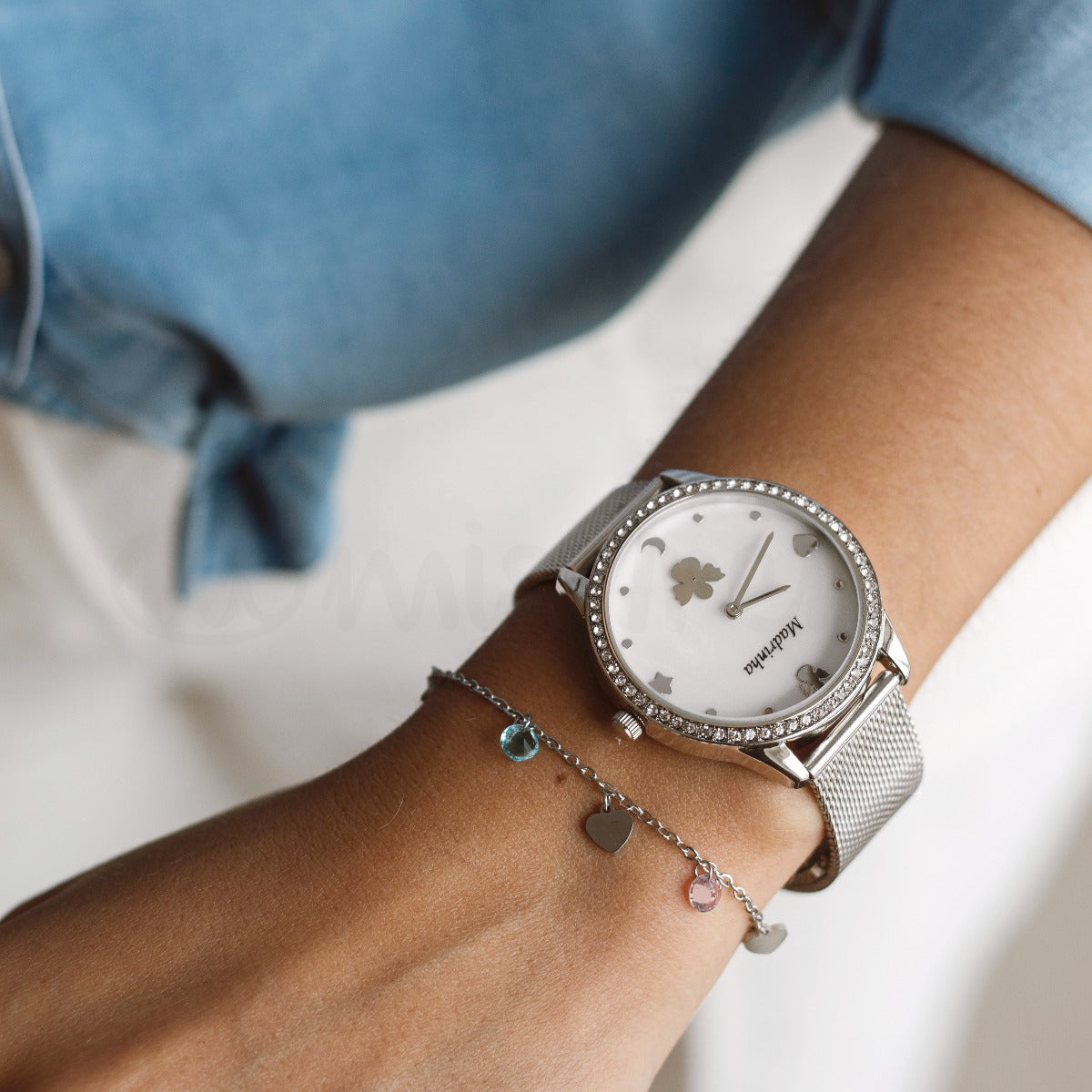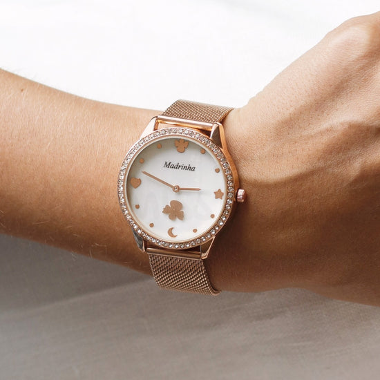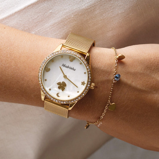 Relógio com fundo madre pérola com dedicatória Madrinha. Com um design moderno e elegante com um aro repleto de brilhantes e imagens de anjos, flor, lua, coração e estrela.