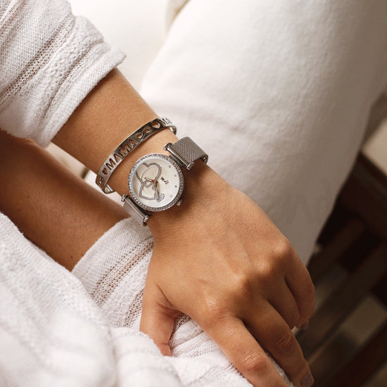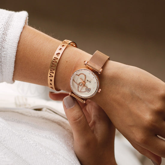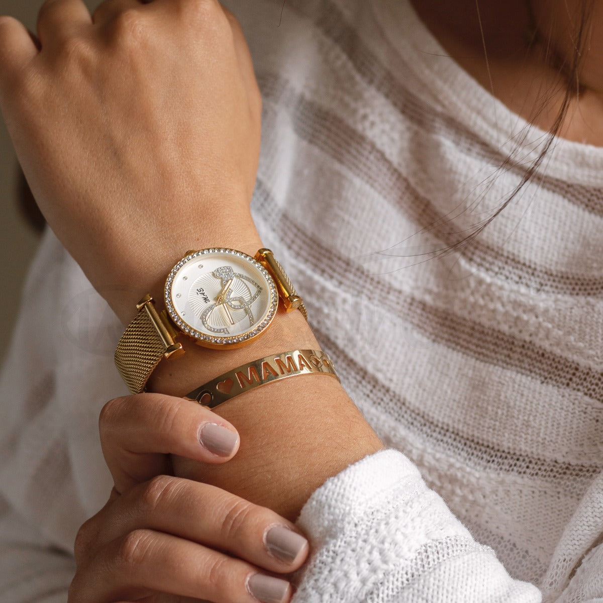 Relógio com dedicação Mãe com 3 corações no interior do mostrador. Repleto de brilho com um aro com brilhantes cravados.