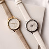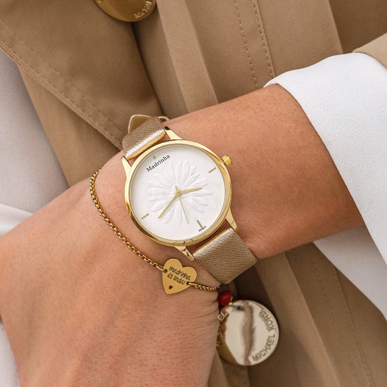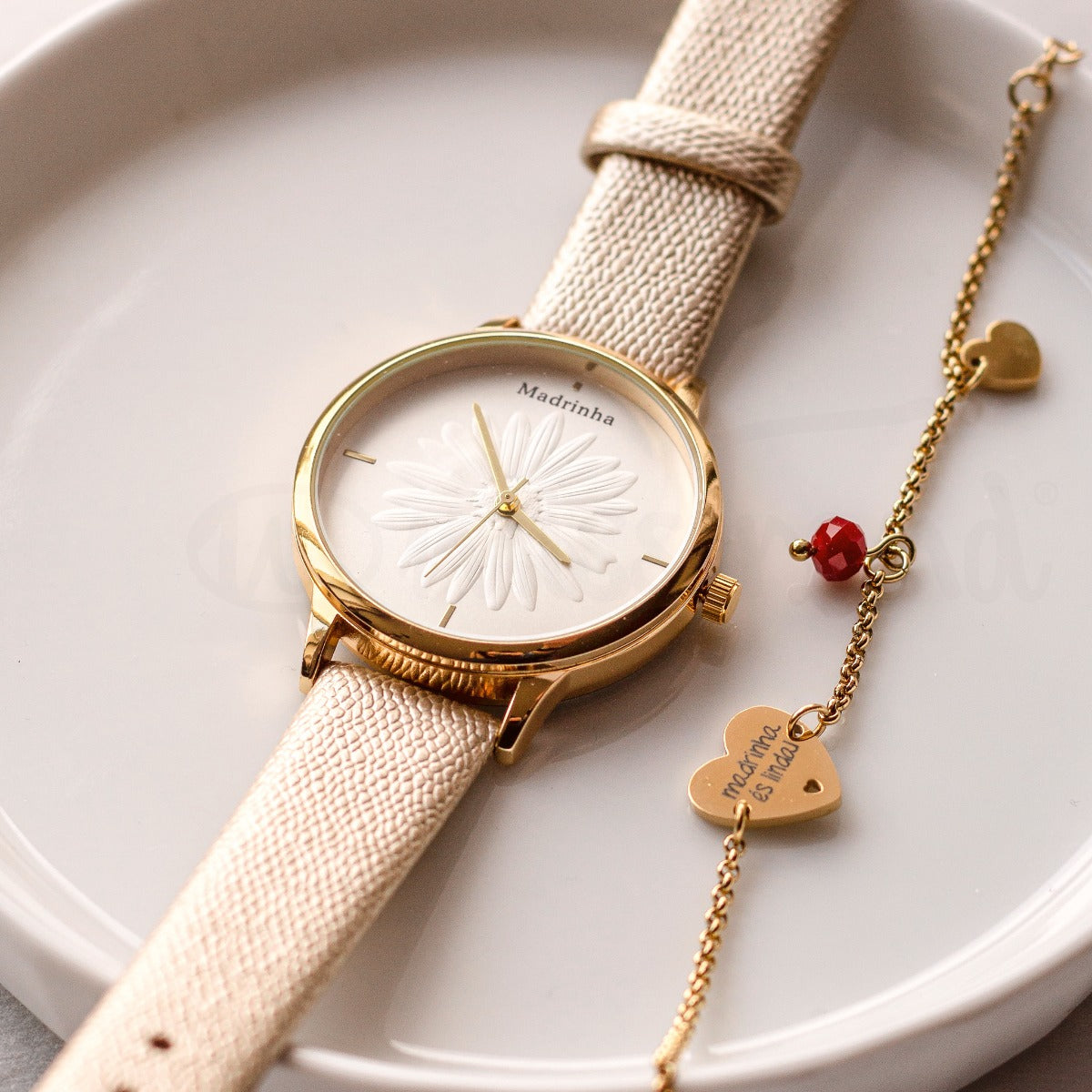 Relógio com dedicatória Madrinha com desenho de malmequer no mostrador, com bracelete em pele sintética com vários furos e com fecho de fivela de um pino.