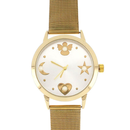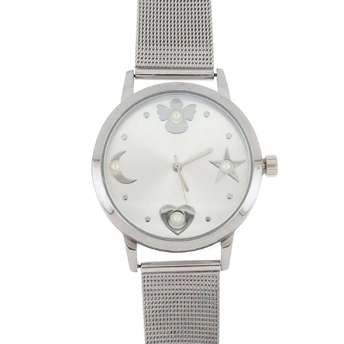 Relógio Pearls com anjo, estrela, coração e lua com pérolas. Composto por uma bracelete em aço inoxidável.
