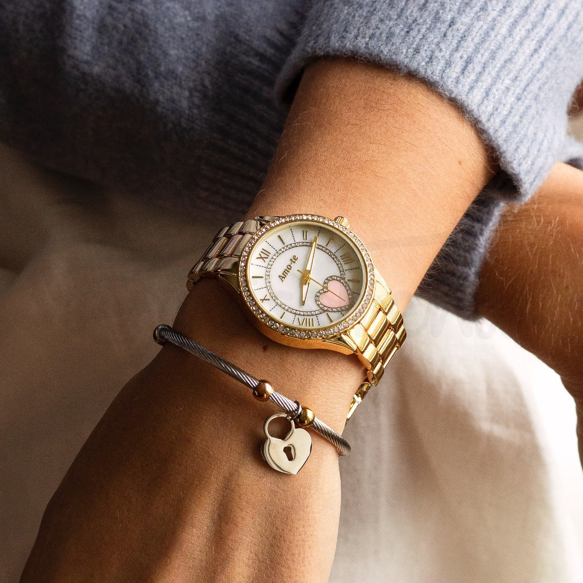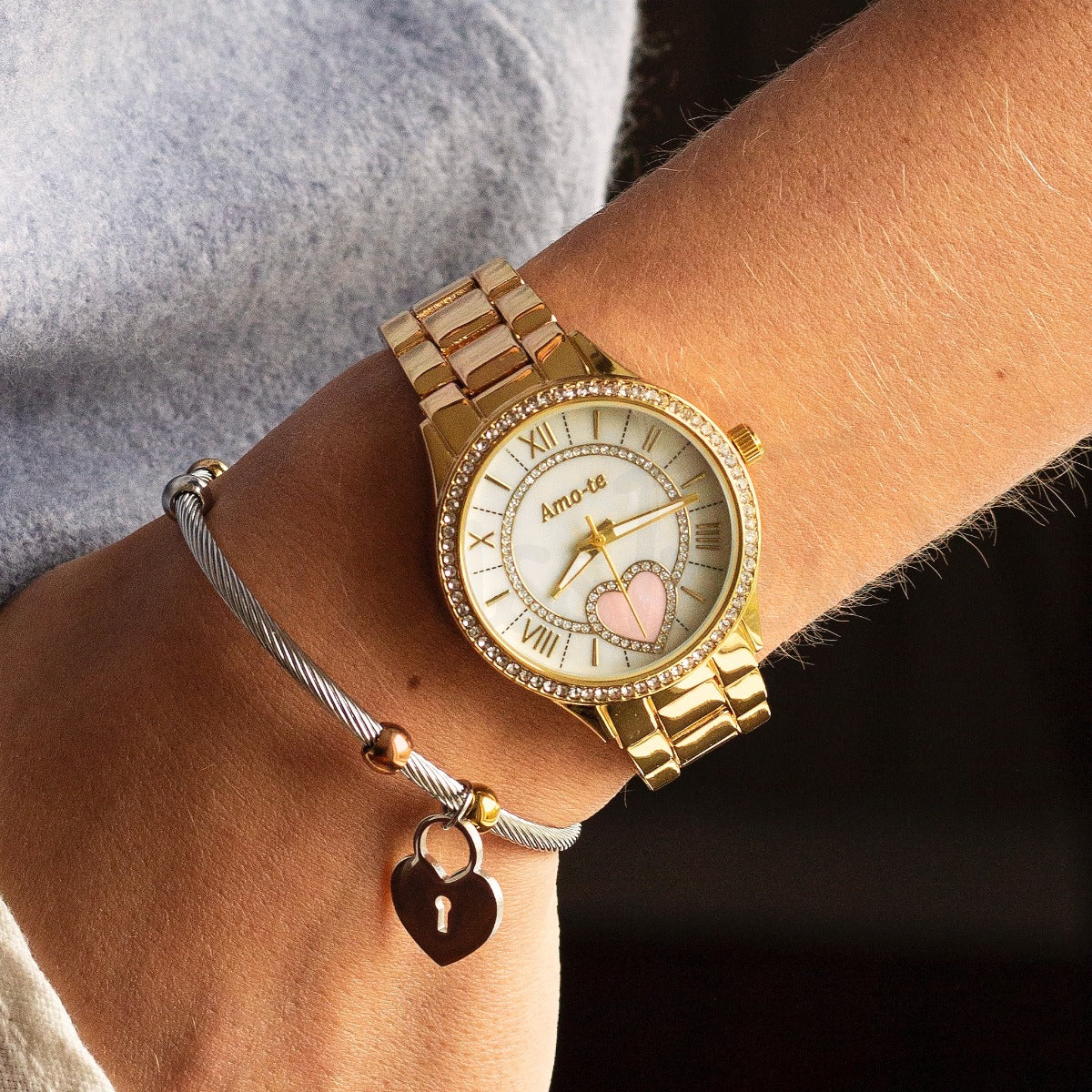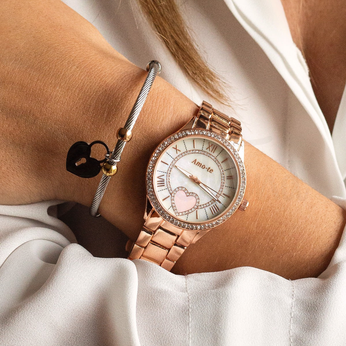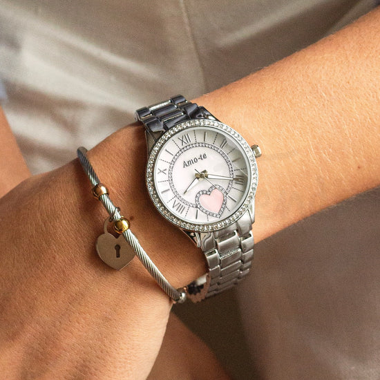 Demonstre à sua cara metade o quanto ela é importante com este relógio com dedicatória Amo-te com aro com brilhantes cravados com numeração romana.