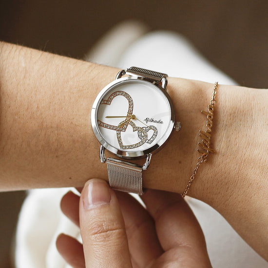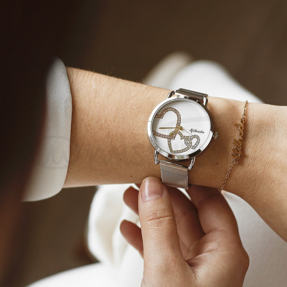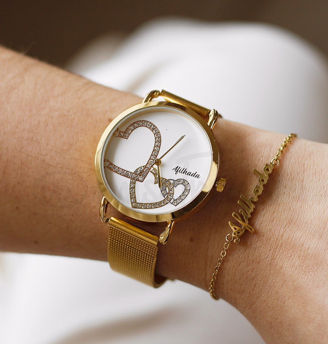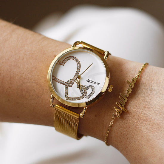 Relógio Tender com dedicatória Afilhada em aço. Um design moderno e elegante com um mostrador com 3 corações multicolor repleto de brilho.