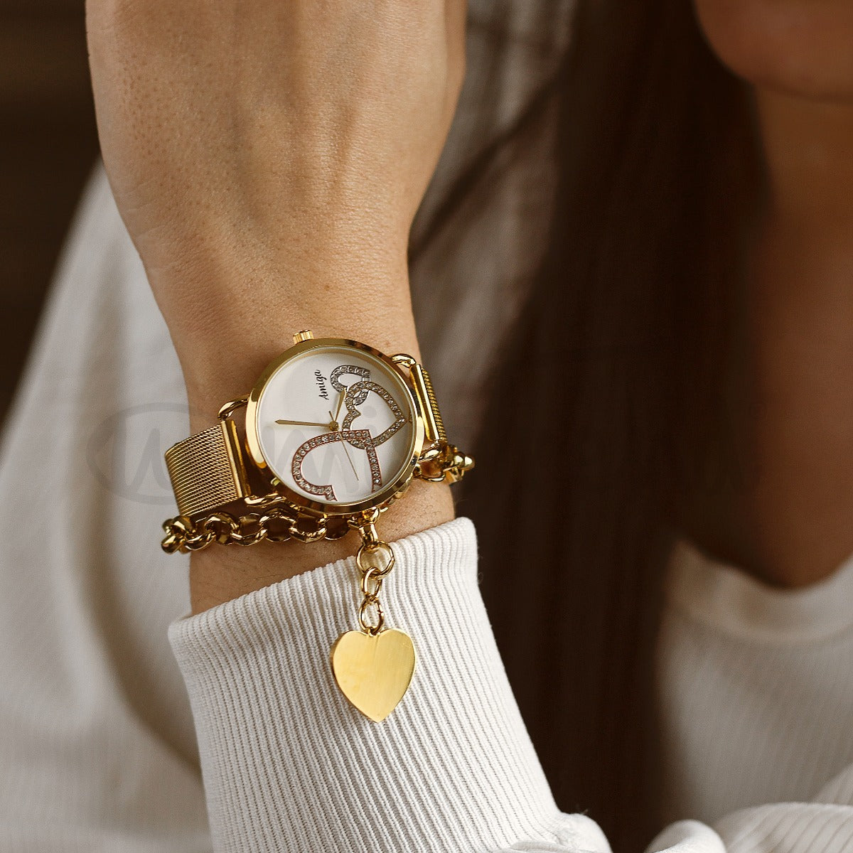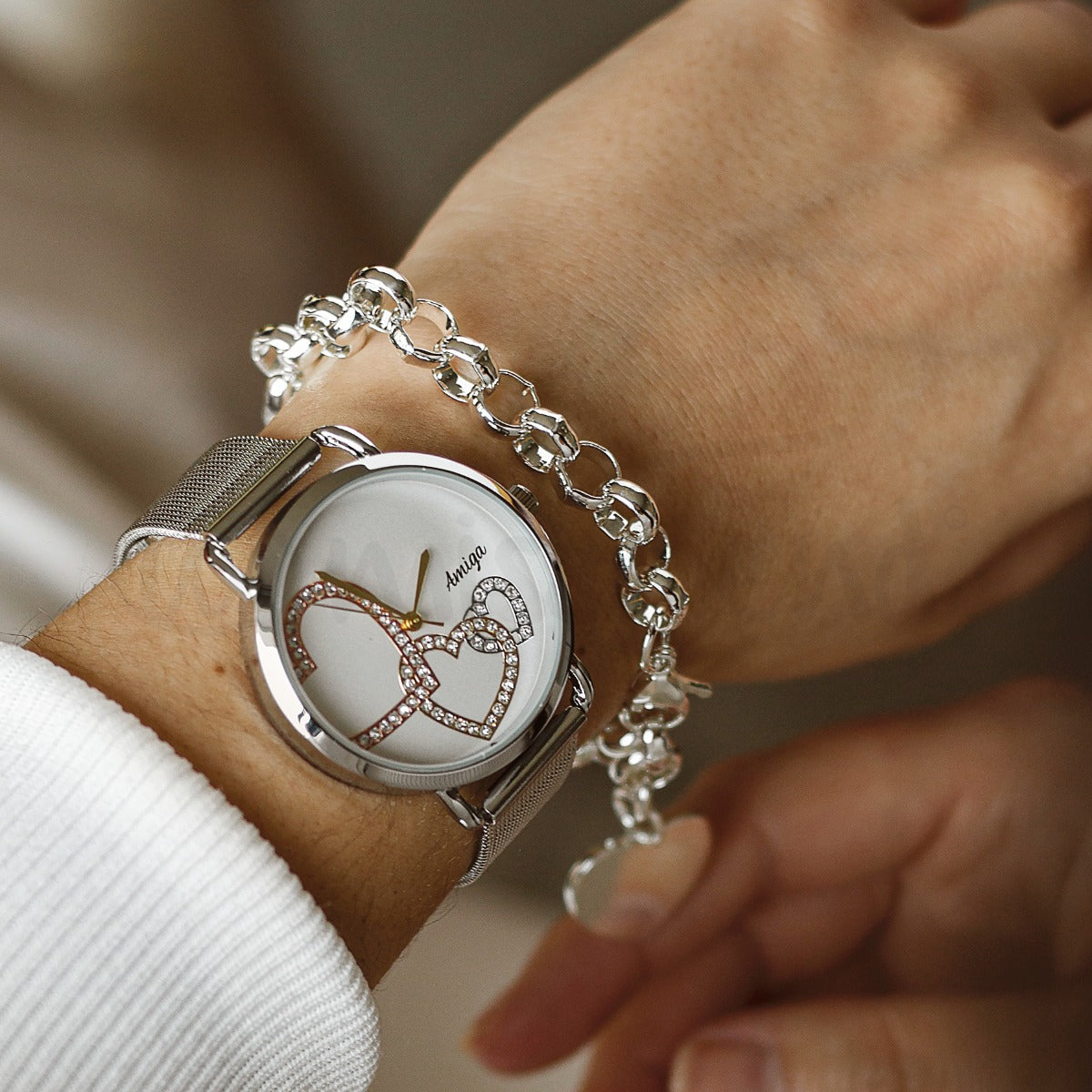 Relógio Tender com dedicatória Amiga em aço. Um design moderno e elegante com um mostrador com 3 corações multicolor repleto de brilho.