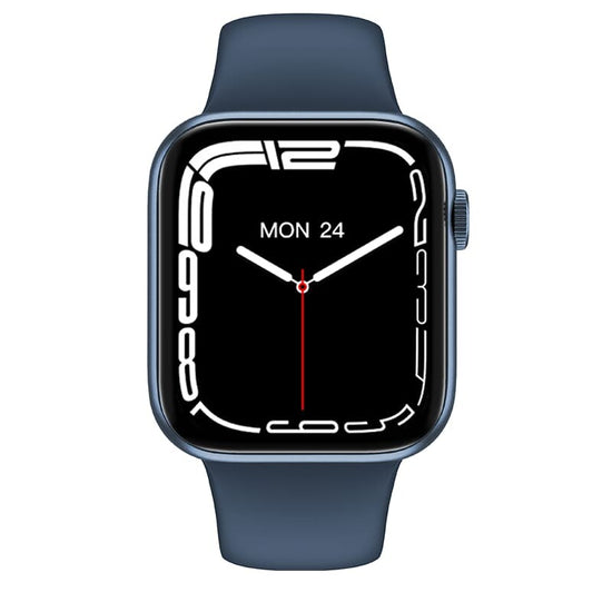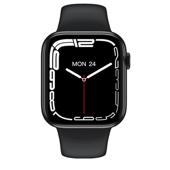 Este Smartwatch apresenta um design moderno e elegante que é um pouco semelhante ao Apple Watch Series 7 . Ele é projetado em formato quadrado com uma tela curva 2.5D nas laterais e possui um botão giratório que funciona para alterar os mostradores do relógio, virar a página, aumentar/diminuir o zoom e há outro botão para o menu ou ligar/desligar. E logo abaixo do botão, encontrará o microfone, e na parte esquerda o altifalante embutido.