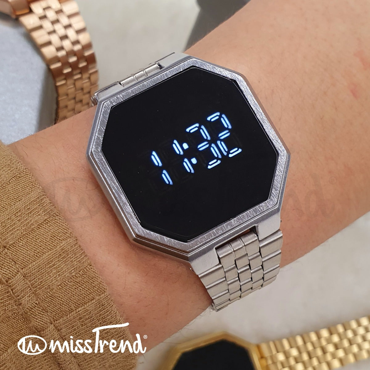 Relógio Digital unissexo em aço, bracelete ajustável a qualquer medida. Relógio mostrador grande com função digital de horas e data. Resistência à água: 3 ATM
